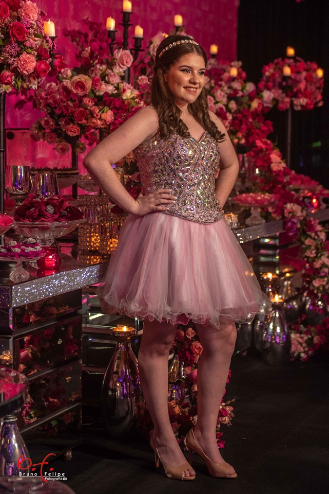 Para a recepção, nossa debutante usou um modelo curtinho em um tom mais claro de rosa. O modelo contava com uma saia de tule e a parte de cima cravejada com cristais.