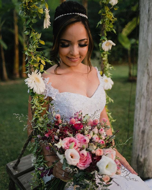 Nossa noiva Pâmella seguiu o conceito boho na escolha de seu vestido. Seu modelo traz as flores como referência principal do estilo, que estão presentes na renda e nos detalhes das mangas. O acabamento possui pontos de brilhos costurados no centro dos bordados florais, que deram um toque sutil e um belo efeito luminoso em contraste com o sol.
