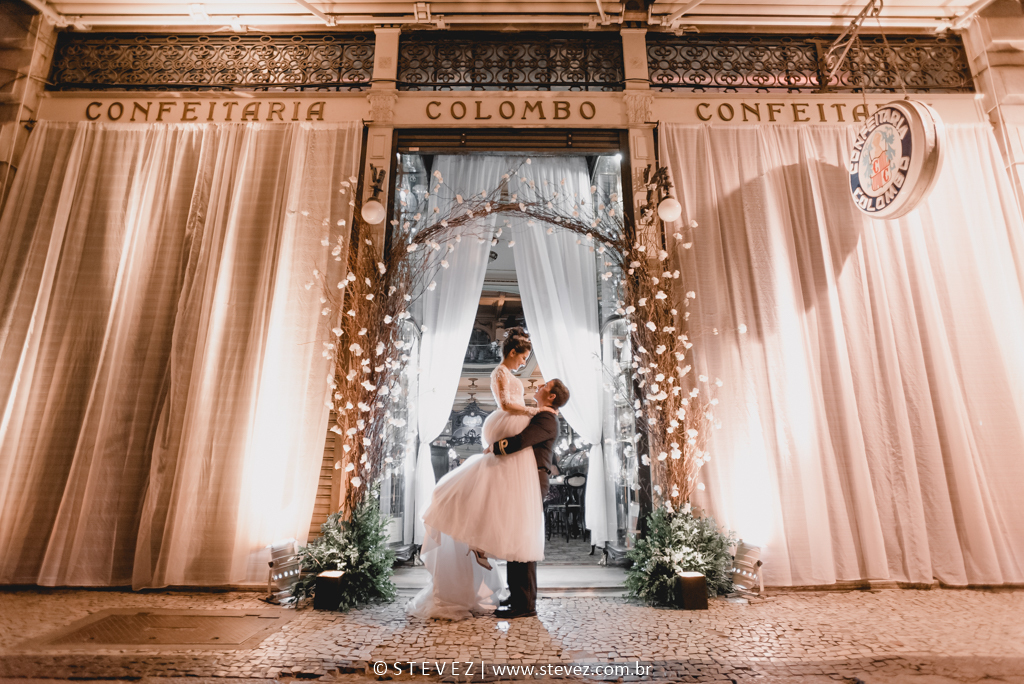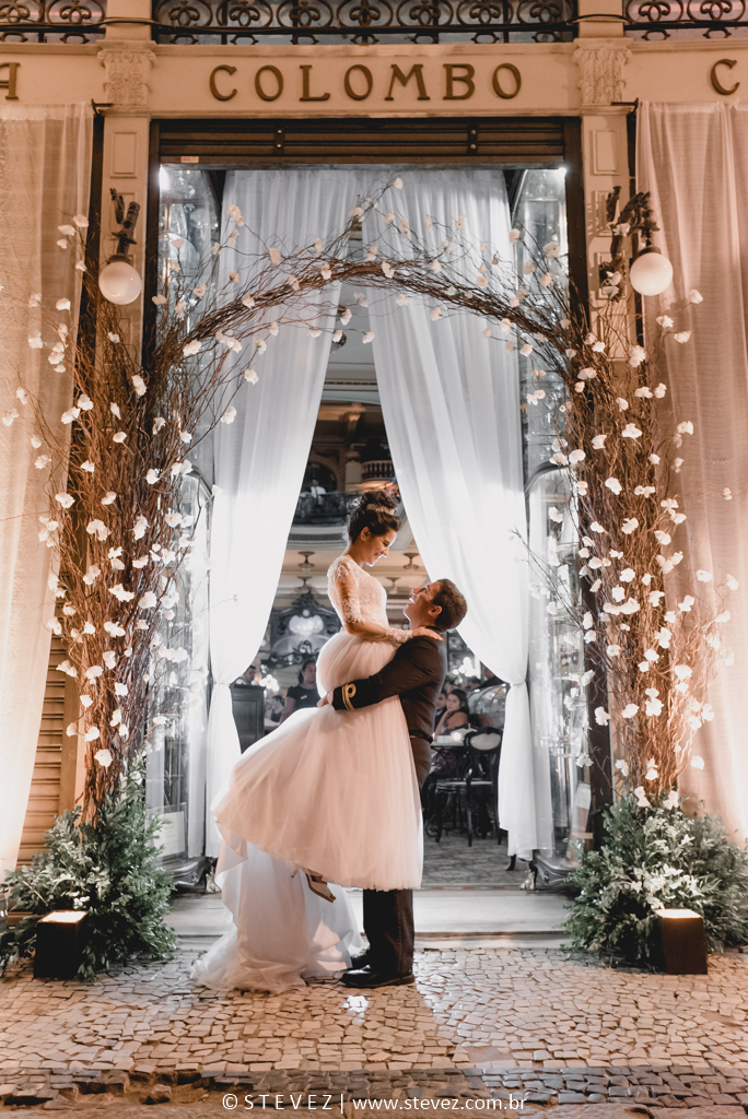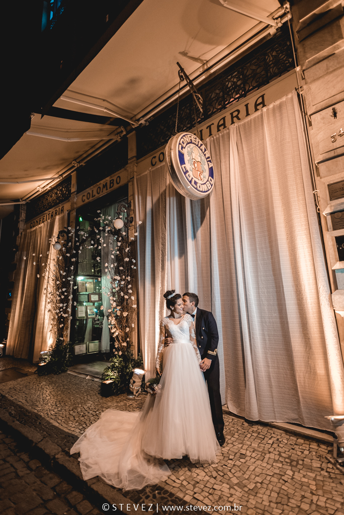 Um patrimônio histórico do Rio de Janeiro, a Confeitaria Colombo é um lugar apaixonante que ultimamente tem sido o espaço para casamentos preferidos dos noivos. Foi o caso da Flávia e do Adriano, que escolheu esse tradicional ponto turístico carioca para celebrar com os convidados após a cerimônia na Igreja.