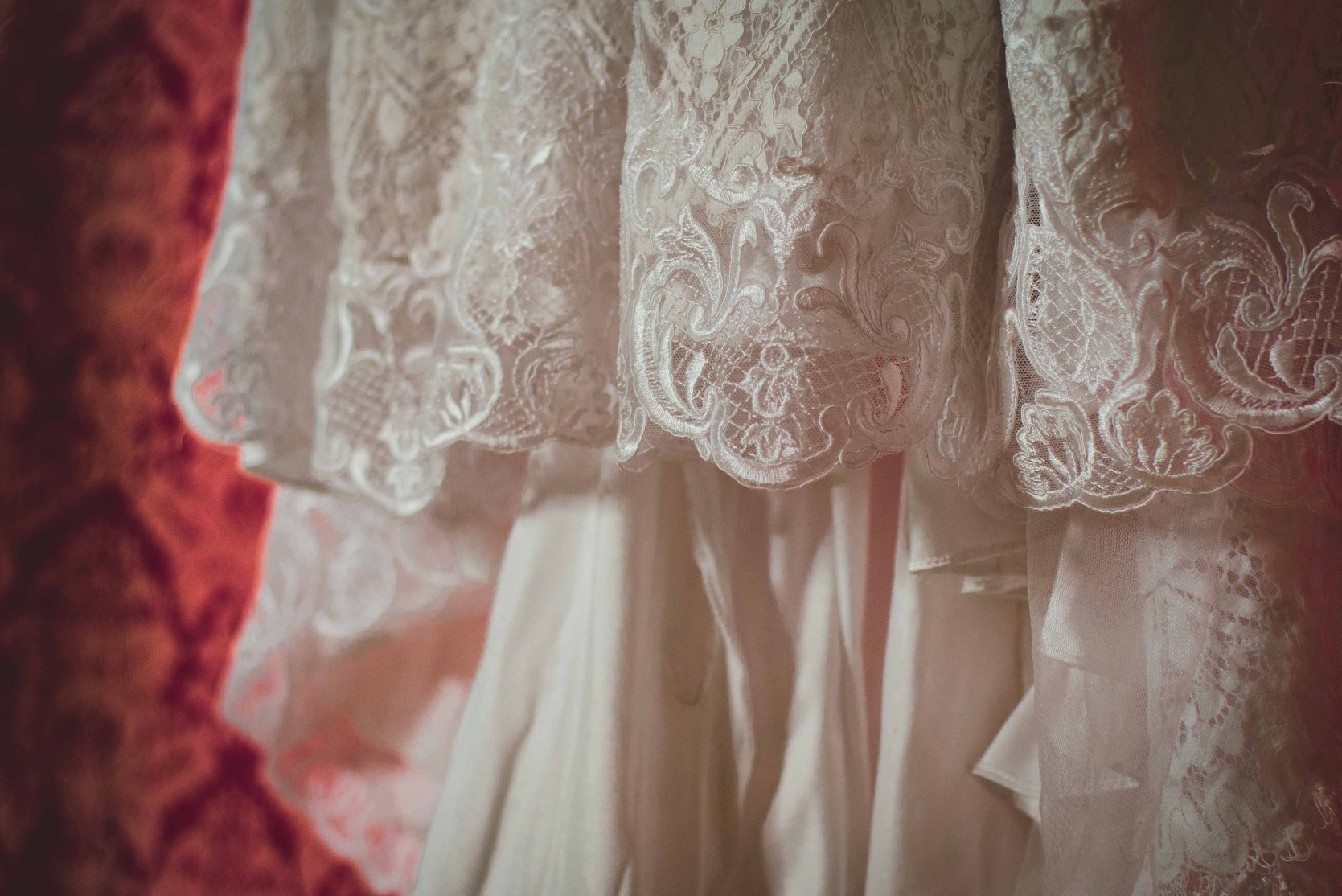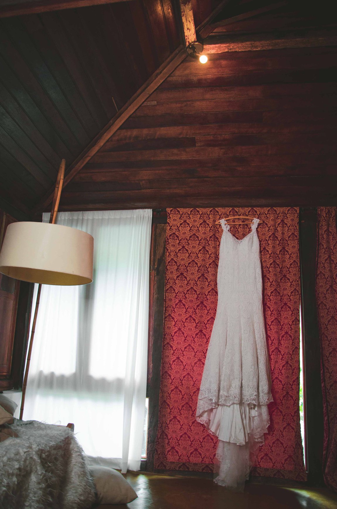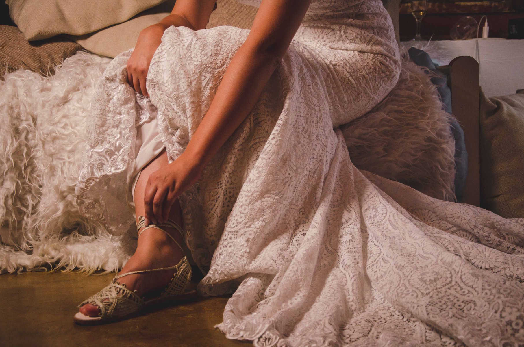 Seu vestido foi totalmente baseado no conceito rústico. O corte sereia trouxe uma silhueta clássica, com uma renda geométrica e mais pesada, em uma inspiração veneziana. Como a cerimônia era ao ar livre e durante o dia, Gláucia preferiu um modelo sem mangas e abdicou do salto alto.