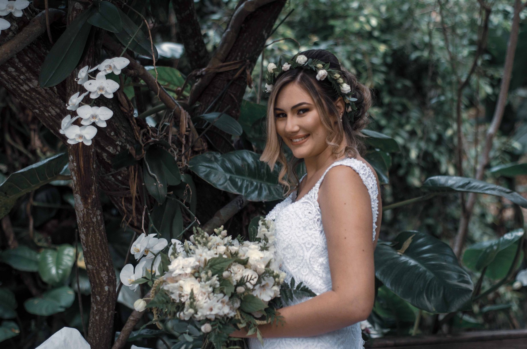 Vestido: Ivana Beaumond Paris. Fotos: Fernanda Líder Fotografia e Davi Santos Fotografia. Local da cerimônia: Uaná Etê. Cabelo e maquiagem: Tiago Trindade e Marcellux. Buquê e coroa de flores: Natália Silvestre Buquês. Cerimonial: Rejane Ribeiro.