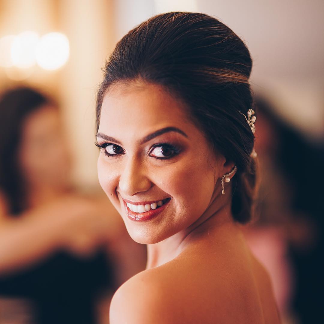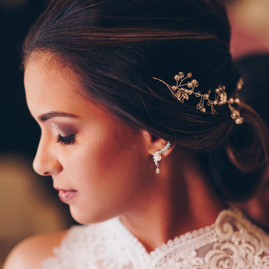 O penteado com coque baixo, além de esteticamente bonito, também ajudou a prevenir contra o vento, que costuma ser um convidado especial em casamentos na praia. Os acessórios abusaram das pérolas, que estava presente nos brincos e na grinalda.