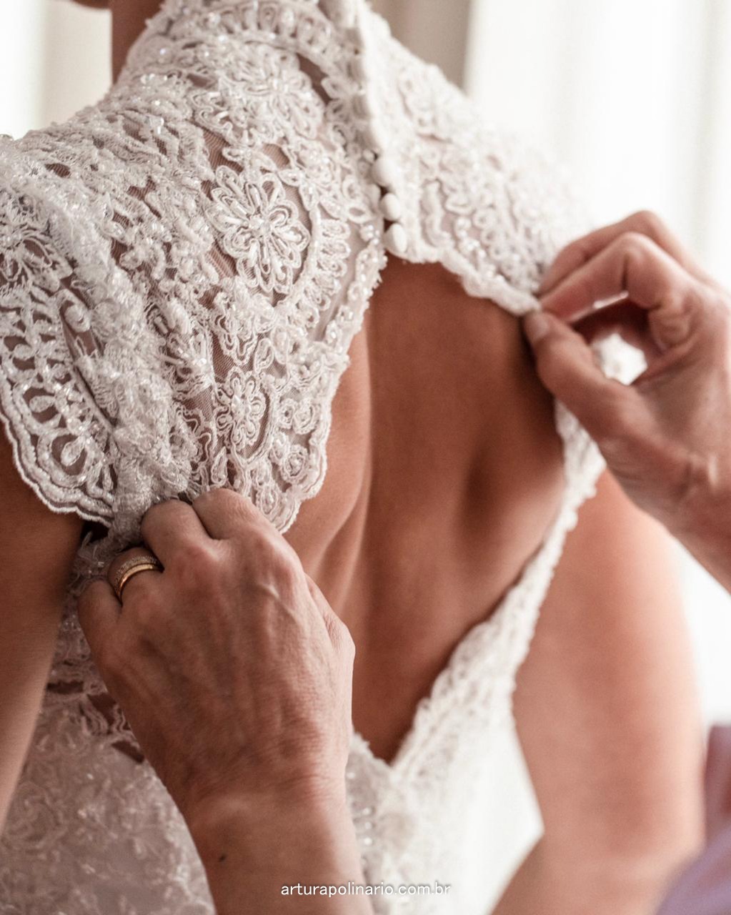 O vestido da Renata é um modelo com silhueta tipo princesa, com mangas curtas de renda romântica, trazendo uma inspiração clássica. Um detalhe sofisticado, o decote nas costas deixou o acabamento mais elegante.