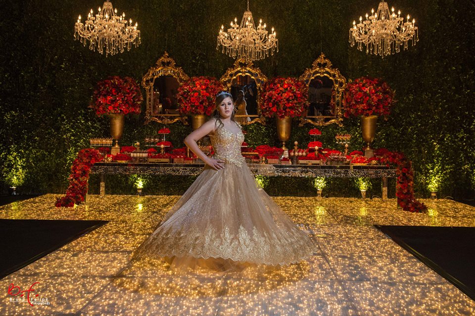 Os encantos de Rafaela, uma menina meiga, encantadora que nos conquistou com todo seu jeitinho brincalhão e sorridente de ser. Sua grande festa foi espetacular, sendo realizada na Mansão das Estrelas, lugar perfeito para a grande festa de Rafa. Nossa Debutante escolheu para sua festas as cores vermelho e dourado, cada detalhe feito com muito amor e carinho para nossa princesa. Rafa escolheu dois modelo exclusivos sob medida, um na cor dourado e outro vermelho, cores do tema da sua festa e com ajuda de nossos estilistas Roni e Florence Beaumond conseguiu transformar seu sonho em realidade.
