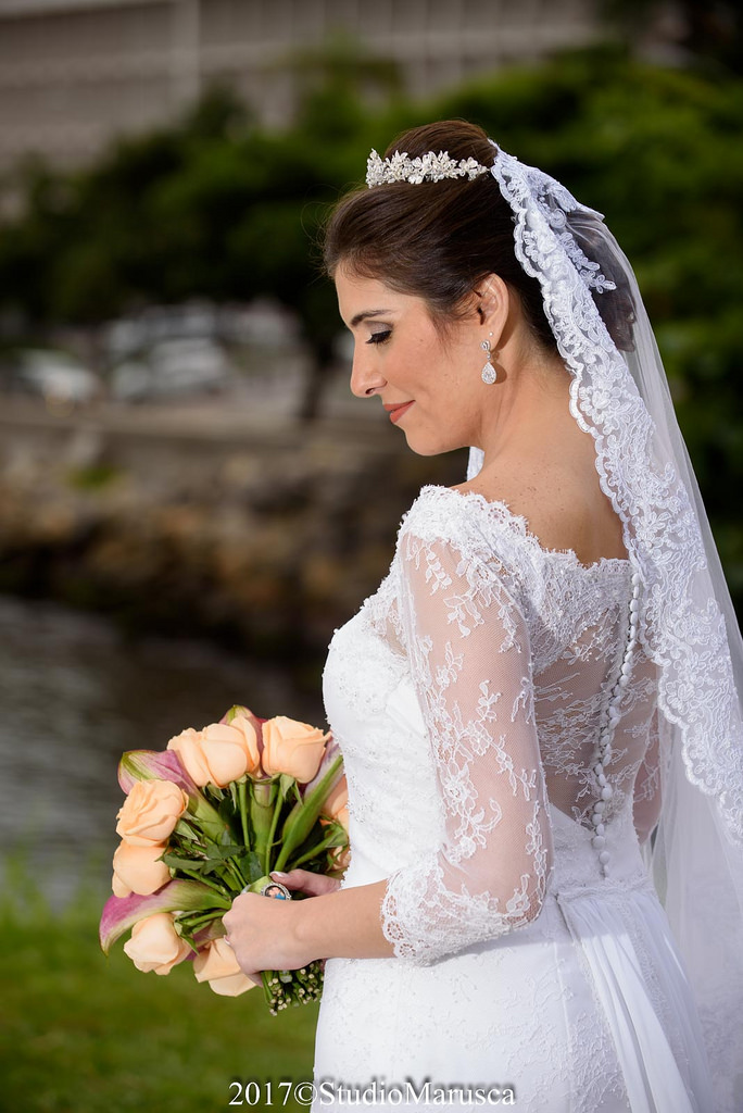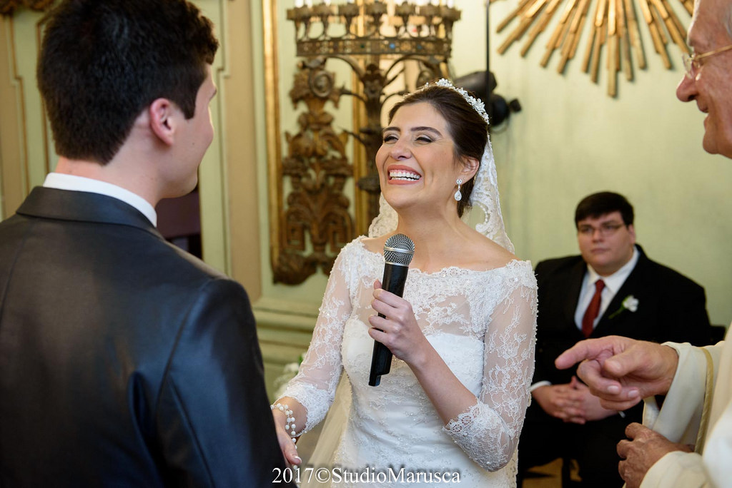 Realizar um casamento de conto de fada, literalmente, já é possível. Tatiana se casou com seu Príncipe Murilo, na belíssima Igreja São José. Para celebrar este dia único de suas vidas, Tati optou pelo atelier Ivana Beaumond para encontrar seu tão sonhado Vestido de Noiva. Muito decidida, meiga com aquele jeitinho encantador, nosso vestido representou muito bem essa noivinha. Um modelo de vestido de noiva com mangas, branco, com rendas francesas aplicadas à mão e levemente bordadas com cristais para realçar seu desenho com mix de materiais como: cristais, pérolas e mini miçangas.