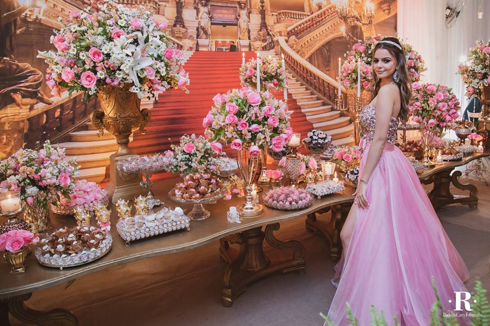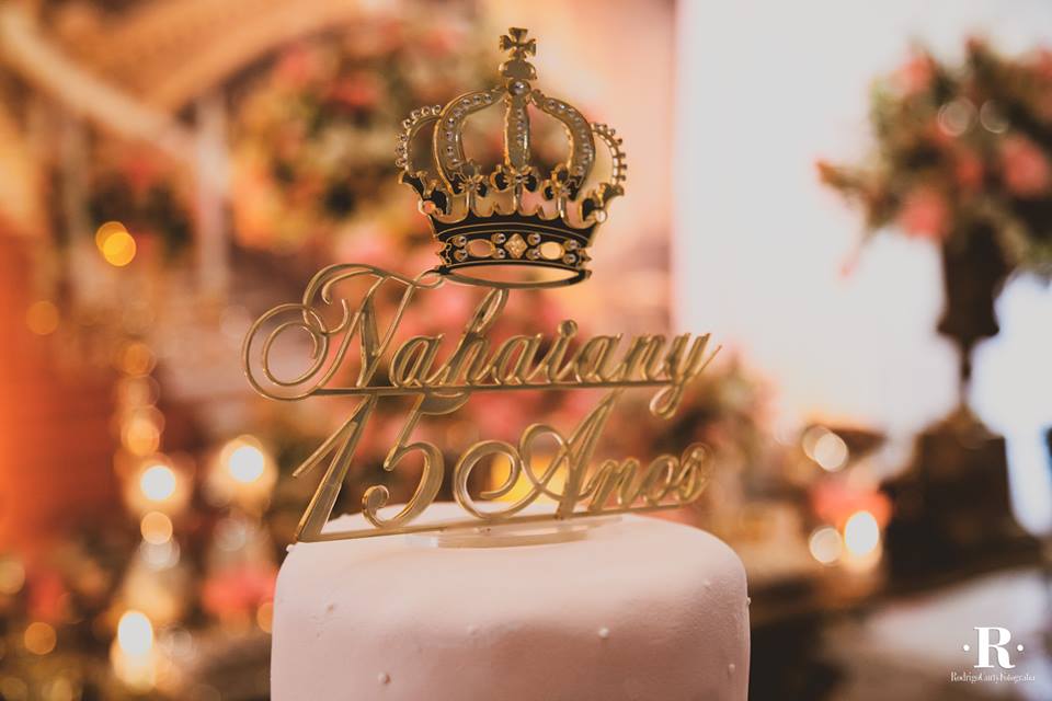 Nossa debutante Nahaiany sonhava com uma festa de 15 anos desde pequena. Suas cores favoritas, rosa e dourado, foram as escolhidas para protagonizar a decoração, que contou com muitas flores, laços, e coroas.