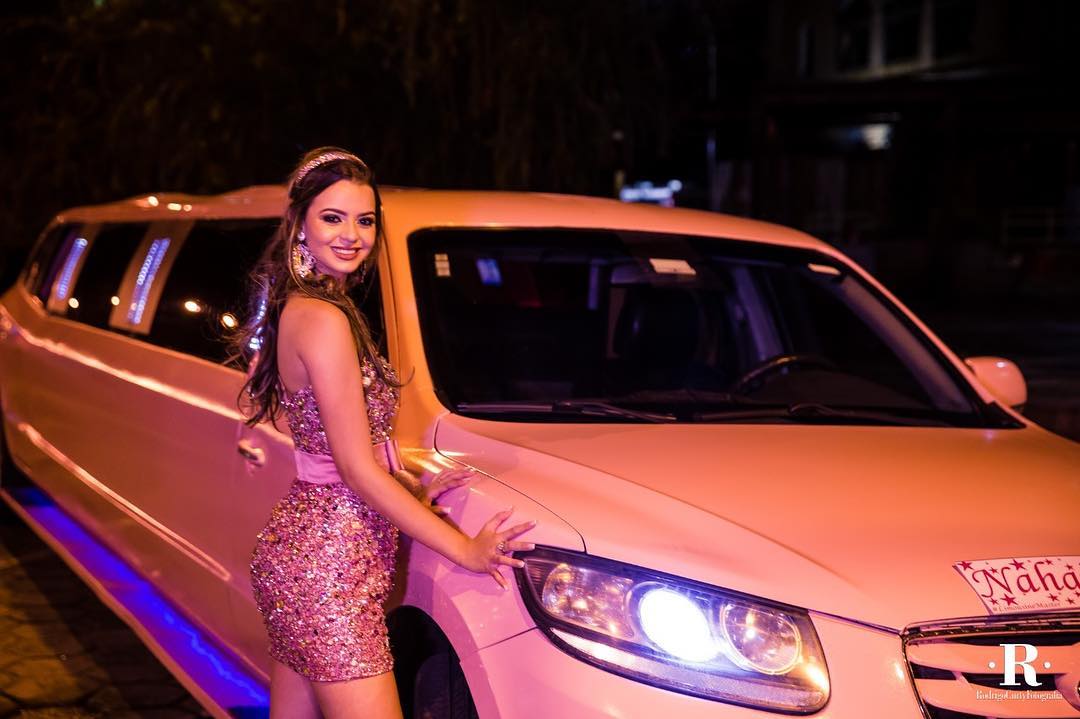 Nahaiany queria que seu debut fosse inesquecível do início ao fim, e já começou chegando na casa de festas de limusine cor-de-rosa com as amigas, no maior estilo red carpet!